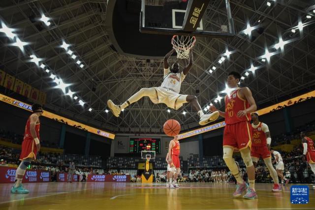 1月15日,四川丰谷酒业队球员加克(上)在比赛中扣篮。新华社记者 江汉 摄